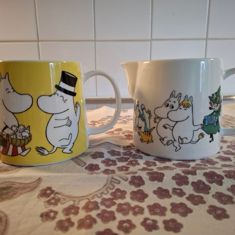 Muggen är dekorerad med Mumin-motiv runtom. Samlarobjekt från 1990-talet.