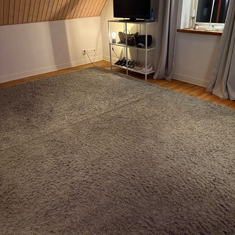 Rusta matta i grå färg. Rektangulär modell med mjuk, lurvig yta som passar exempelvis i vardagsrum, sovrum eller hall. Lämplig för inomhusbruk på hårda golv som trä eller laminat.