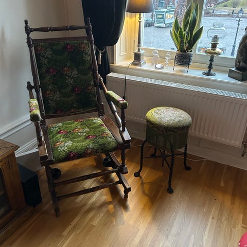 Gungstol i trä med grön klädsel på sits och rygg. Ryggstödet har en broderad textil med blommotiv och sitsen är klädd i enfärgad grön textil. Träramen har svarvade detaljer i armstöd och medar. Konstruktionen och gungmekanismen är typisk för så kallade platform rockers, en modell som tillverkades kring sekelskiftet 1900 (ca 1880–1910). Klädseln är omgjord senare, vilket är vanligt för stolar av denna ålder.