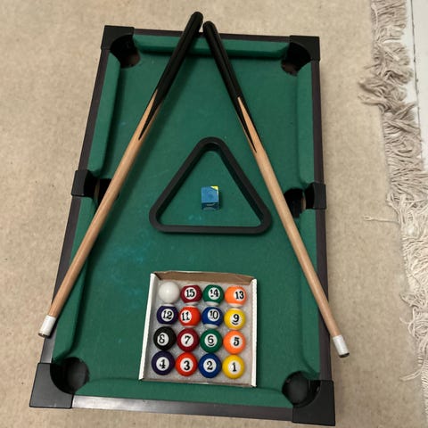 Litet bärbart biljardbord för barn som lätt kan användas ställt på golv eller bord. Jättekul men har nu vuxit ur det.