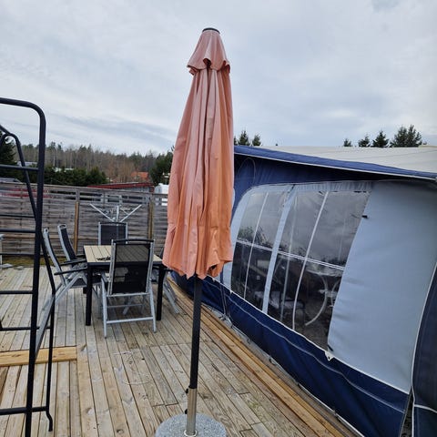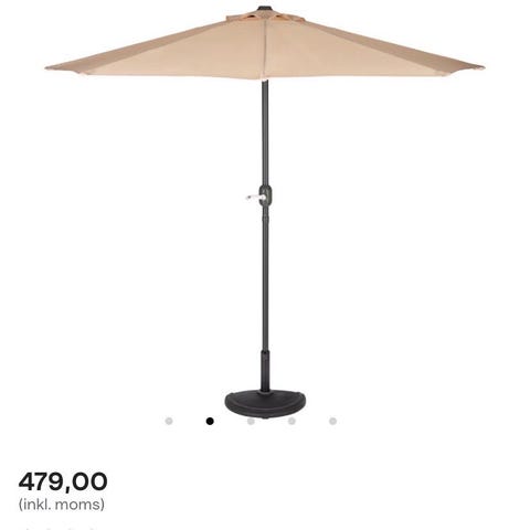 Parasoll i blå färg ca 3 m i diameter Stång och ribbor i l metall och metallfot Passar för trädgård, altan eller uteplats som solskydd. Parasollen har rund form
