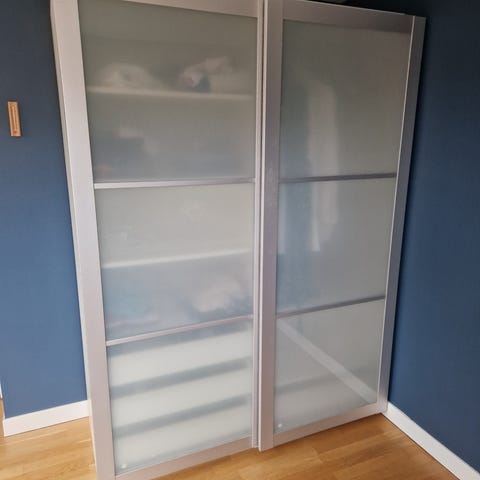 IKEA garderob med skjutdörrar i spegelglas och vit stomme. Garderoben har flera öppna hyllplan, utdragslådor och trådkorgar för förvaring av kläder och accessoarer. Invändigt finns även klädstång och mindre fack för organiserad förvaring. Passar som garderob i sovrum, hall eller klädkammare.