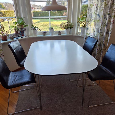 Matgrupp med 4 stolar. Runt bord med sk. Trumpetfot. Diameter 110 cm. Stolar har skav i konstlädret. Bordsskivan har lite märken och någon mindre missfärgning.Inköpt på Mio.