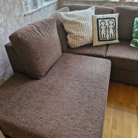 Då soffan inte ska få följa med i flytten ska den bort. Väldigt skön att slappa/titta på tv i. Tyget skulle behöva en tvätt men i övrigt inget fel på den. Divandelen är 225 cm.