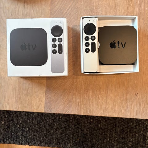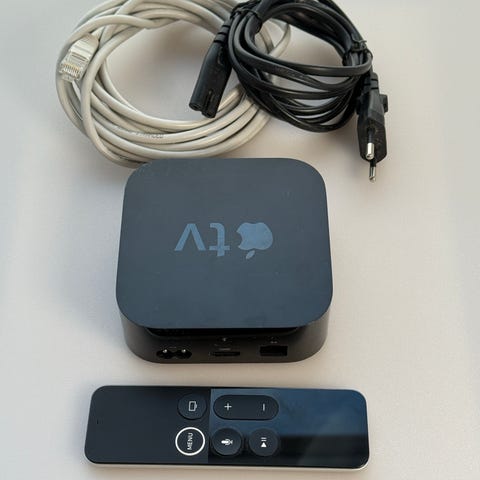 Apple TV mediaspelare i svart färg. Enheten ansluts till TV via HDMI och har nätverksport, optisk ljudutgång och strömanslutning på baksidan. Fjärrkontroll och strömkabel ingår enligt bild. Lämplig för uppspelning av digitalt innehåll till TV via nätverk och internet.