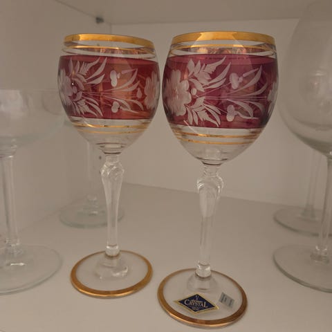 ett gult och ett blått glas i böhmisk kristall. Säljs tillsammans för 200:- ELLER 120:-/styck. Skickar inte, glasen finns i Bromma Ulvsunda