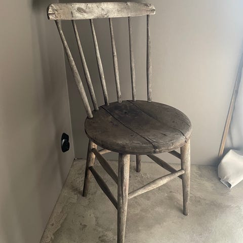 Trästol med armstöd i ruffigt målat trä. Köpt på antikhandel. Stolen har rak rygg med lodräta spjälor och plan sits. Benen är runda och lätt snedställda för stabilitet. Passar som sittmöbel i exempelvis vardagsrum, hall eller arbetsrum.