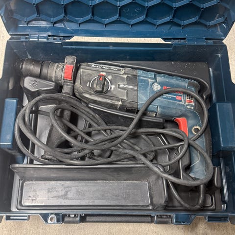 Borrhammare av märke Jula . Levereras i hård plastväska tillsammans med sidhandtag och flera mejslar/borrar. Verktyget är nätanslutet och lämpar sig för borrning och mejsling i exempelvis betong, sten eller murverk. Plastväskan ger skydd och gör det enklare att transportera och förvara maskin och tillbehör samlat.
