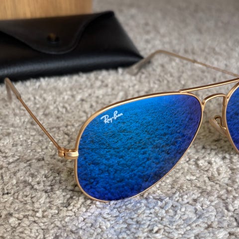 Ray Ban Aviator/ pilot solglasögon är en av de mest ikoniska solglasögon modellen i världen. Dessa har guldfärgade bågar och gröna linser. De är i mycket fint skick! Nyskick.