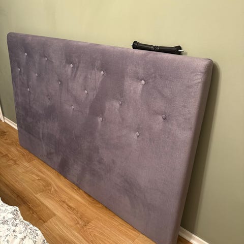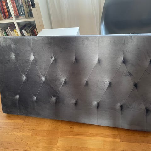 Mio Mary sänggavel i grå sammetsliknande textil. Gaveln har knapptuftad framsida och slät baksida med fästen för montering mot vägg eller säng. Passar som huvudgavel till säng och ger en mjuk yta att luta sig mot vid exempelvis läsning eller tv-tittande i sovrummet.