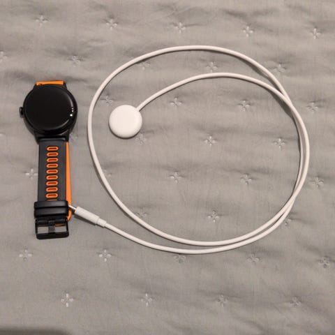 Aktivitetsarmband med medföljande USB‑laddkabel. Armbandet har display på ovansidan och justerbart band i svart med kontrastfärg på insidan. Laddkabeln ansluts via USB i ena änden och magnetkontakt i andra änden som fästs mot armbandet. Produkten kan användas för att mäta och visa olika aktivitets- eller hälsorelaterade data beroende på modell och inställningar.