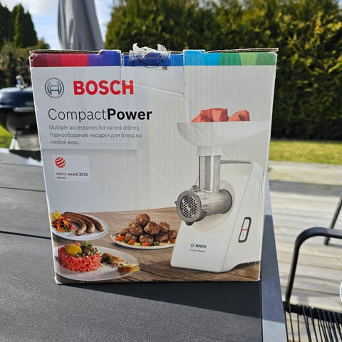 Bosch köttkvarn, testad en gång alla tillbehör samt bruksanvisning finns. Bild tagen från internet.