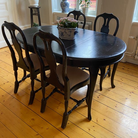 Bordet har klassisk form med svängda ben och två extra skivor 2 st 89 x 35 för förlängning. Stolarna har profilerad rygg och är målade i samma svarta ton som bordet. Passar som matplats i kök eller vardagsrum.