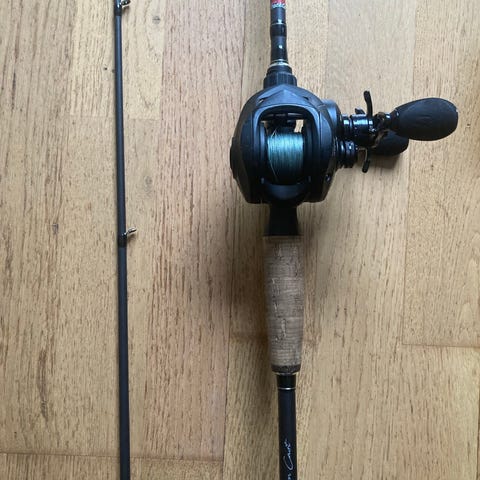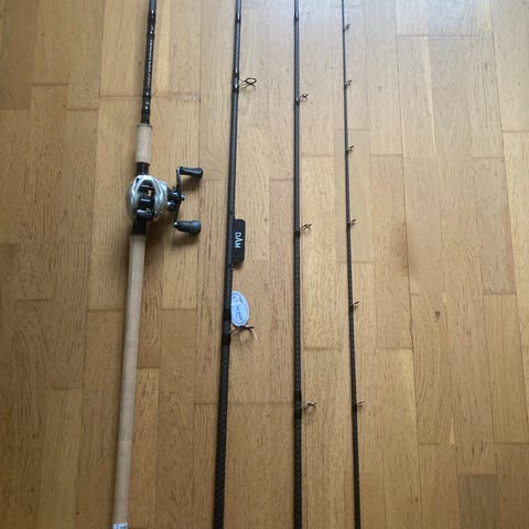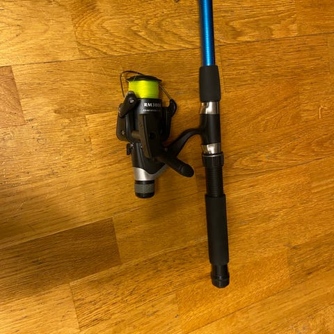 Tvådelat haspelspö med tillhörande haspelrulle. Spöt är svart med korkhandtag och är uppdelat i två delar för enklare transport och förvaring. Rullen är i metall med guldfärgad/orange spole och vev. Utrustningen lämpar sig för allroundfiske från land eller båt, exempelvis efter insjöfisk eller lätt kustfiske. Exakt längd, 180 cm Line 6-12 lbs . Allt är helt nytt. Säljes pga dubbla uppsättningar. Finns på Ersboda. Skickas inte.. 400:- för allt
