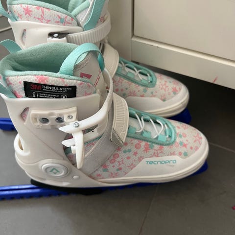 Tecnopro konståkningsskridskor för barn i storlek 31. Skridskorna är vita med rosa detaljer, rosa snörning och dekor med snöflingor. Modellen har klassisk konståkningsklinga i metall och högre skaft för stöd runt fot och ankel. Sparsamt använda, mycket fint skick.
