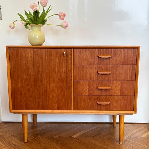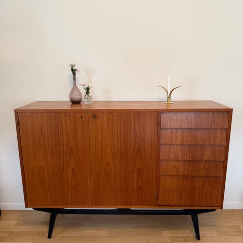Vi säljer vårt fina sideboard i teak. På två av lådorna saknas små knoppar, se bilder. En nyckel finns.
