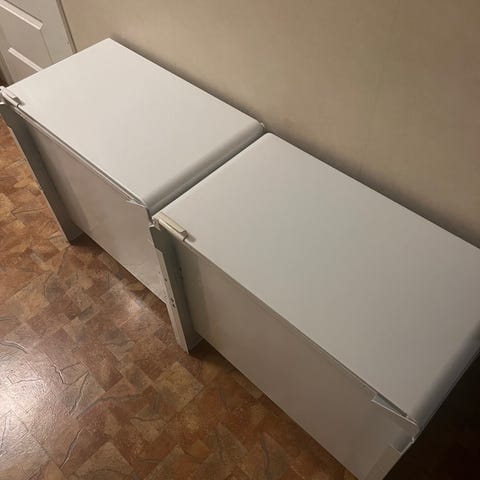 Två överskåp i plåt till kyl och frys.