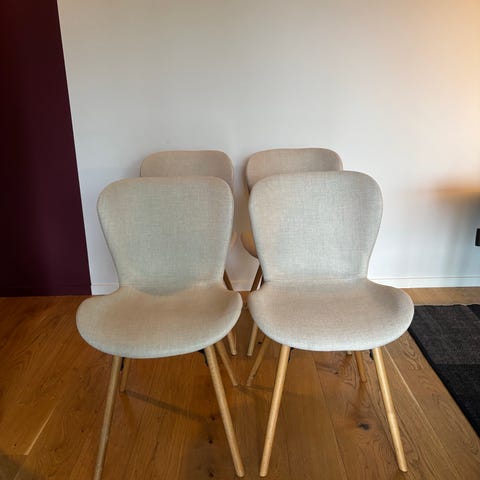 Säljer 6 matstolar från Mio. Klassisk modell med trä och vit sits. Stolarna är välanvända och har skavanker samt repor i både träet och sitsen, men fungerar bra.