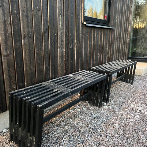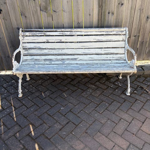 Två trädgårdsbänkar i kombination av trä och metall. Båda bänkarna har sits och ryggstöd i trä med metallstativ. En bänk har dekorativa gjutna sidostycken och en mer klassisk parkbänksdesign. Den andra bänken har metallrygg med rutmönster och raka metallben. Passar som sittplatser i trädgård, på uteplats eller vid husvägg. Skick och ytskikt framgår av bilderna och kan behöva underhåll eller renovering.