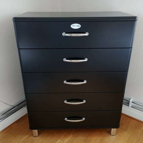 Malibu by Tenzo byrå med fyra lådor, skogsgrön. 50/60tals design. Byrån har rundade hörn och metallhandtag i kromfärg samt runda metallben. Passar som förvaringsmöbel i till exempel sovrum, hall eller vardagsrum. Inredningen består av fyra rymliga lådor för kläder, textilier eller annan förvaring.