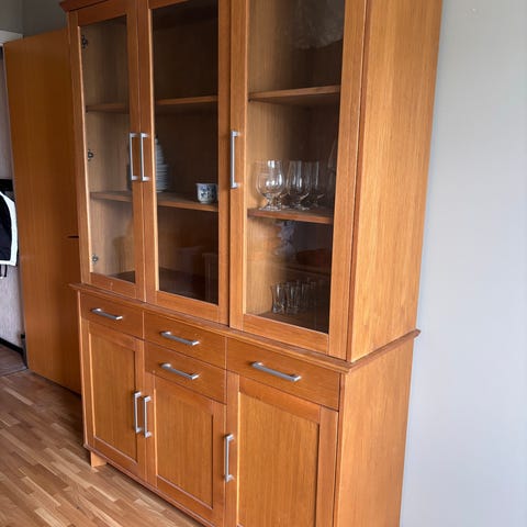 Vitrinskåp och skänk i furu. Överdel med två vitrindörrar med glasrutor och öppna hyllplan i mitten. Underdel med två skåp med trädörrar, tre lådor i mitten samt ett mindre skåp. Metallbeslag på dörrar och lådor. Passar som förvaringsmöbel i kök, matsal eller vardagsrum.