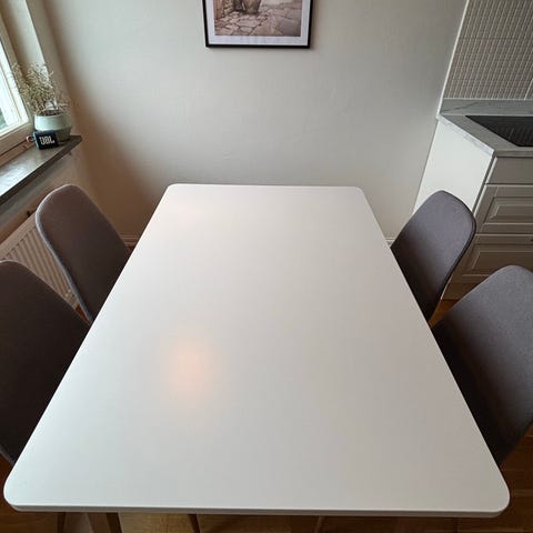 Vitt matbord med ekklädda metallben. Bordsskivan har en del repor och är därför i behov av en duk om man vill dölja dem.
