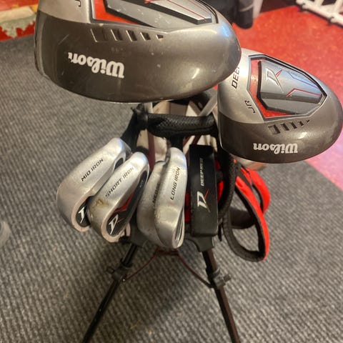 Wilson järnset (dam) med bag i röd och svart färg. Setet innehåller flera järnklubbor och en golfbag med axelrem. 4-S. Järn 7a har oversize grepp.