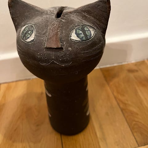 Keramikfigur i form av en katt i blå glasyr på tradera säljs för 6500kr alla föremål säljs för 7000kr
