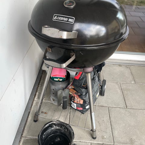 Napoleon kolgrill i vagnmodell med lock. Grillen har svart kupolformat lock och grillyta monterad på en robust vagn med två hjul för enklare förflyttning. På ena sidan finns ett fast sidobord i metall som ger extra avställningsyta vid matlagning. Underdelen har förvaringsutrymme och frontpanel med Napoleon-logotyp. Passar för grillning utomhus i trädgård, på uteplats eller altan.