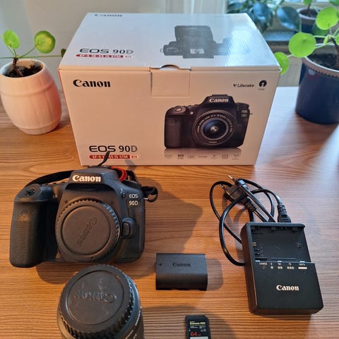 Canon EOS 90D digital systemkamera med objektiv och tillbehör.