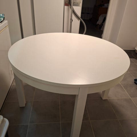 Runt vitt matbord med iläggsskiva