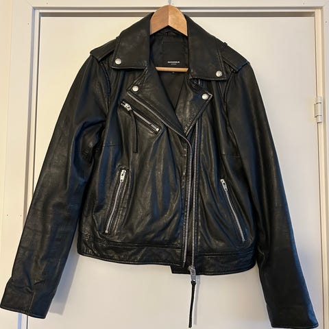 Zara jacka för dam i storlek L. Jackan är svart och tillverkad i fuskläder. Modellen har flera dragkedjeförsedda fickor framtill, snedställd dragkedja och justerbart bälte nedtill.