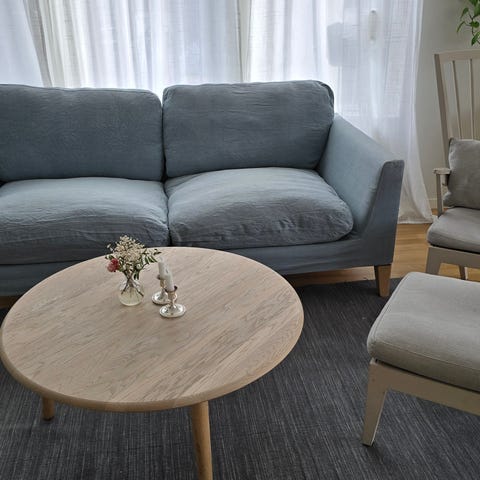Avtagbar klädsel i 100 procent ull, tyrol mörkgrå. Ben i såpad björk. Rena naturmaterial rakt igenom.