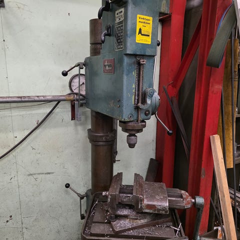 Bänkborrmaskin i grön metall. Maskinen är av pelartyp för bordsmontering med justerbart borrbord och skyddskåpa runt chucken. Utrustad med handtag för matning av borrspindeln samt elanslutning med strömbrytare. Lämplig för borrning i trä, plast och metall i hobbyverkstad. Remdriven växellåda ställbar för 600-2600rpm. Osäker på ålder men den har använts sparsamt genom åren. Hämtas i västra Göteborg.