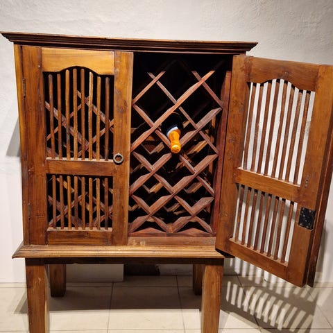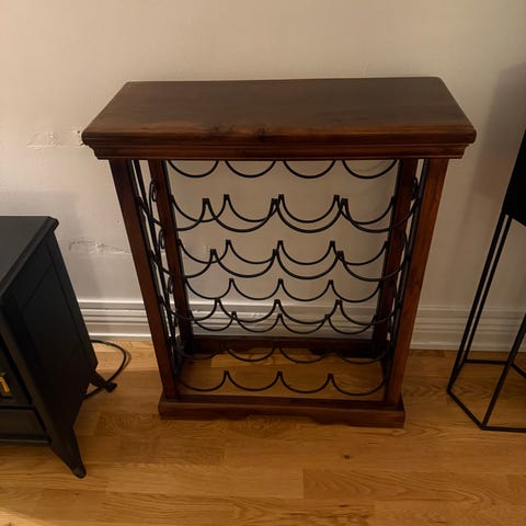 Ett trevligt vinställ/vinskåp för 20 flaskor. På ovansidan är det en liten glipa och något som ser ut som en skada men fanns redan vid köpet, därav lägre pris.