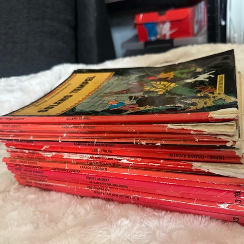 Volym 1-18. Inbundna böcker på svenska med blåa omslag, numrerade 1–18 på framsidan. Passar för läsare som vill ha en samlad utgåva av Hergés serier på svenska.