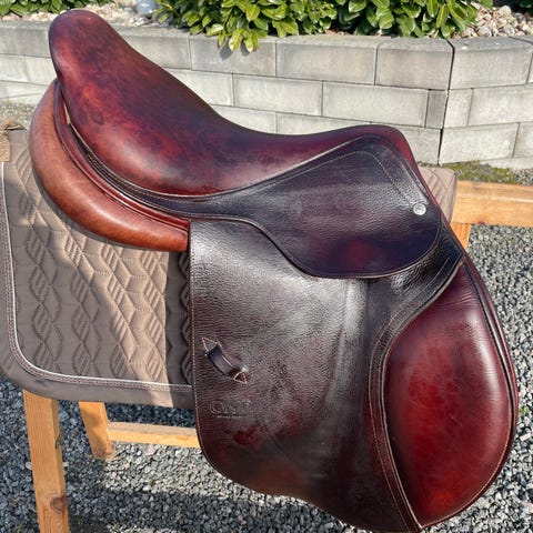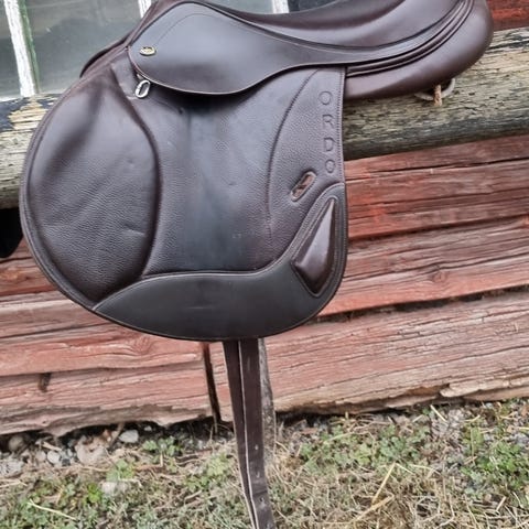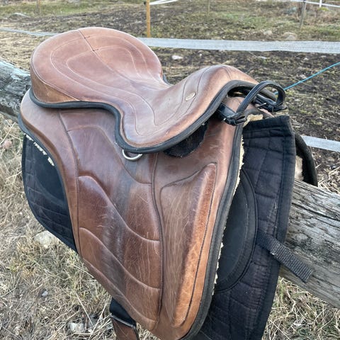 Kieffer barbackasadel i brunt läder. Sadeln är utformad utan traditionligt bom, med mjuk sits och markerat stöd fram och bak. Utrustad med flera D-ringar för fäste av tillbehör samt stigläder och stigbyglar. Passar för barbackaridning och uteritter där nära kontakt med hästen önskas. Lädret har dekorativa sömmar och inslag av fårskinn vid sitsen för ökad komfort.