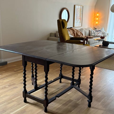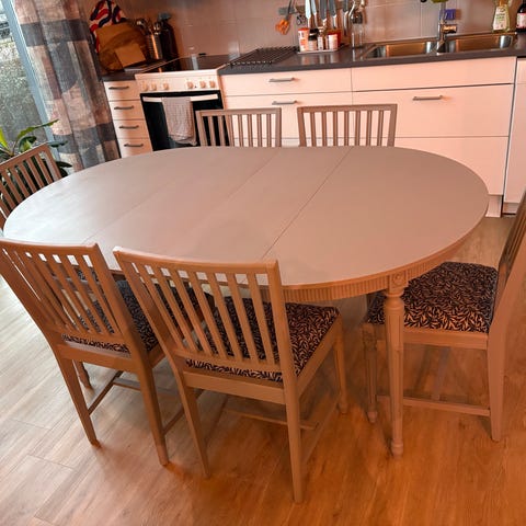 Mått 100x150 höjd 75 cm med två iläggsskivor på 30 cm vardera. Lite slitage på skivan annars stabilt och i fint skick.