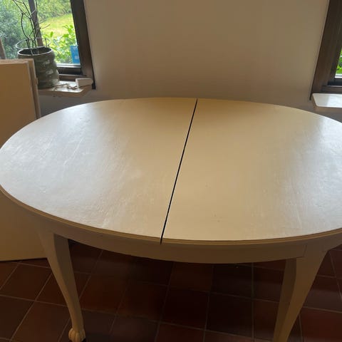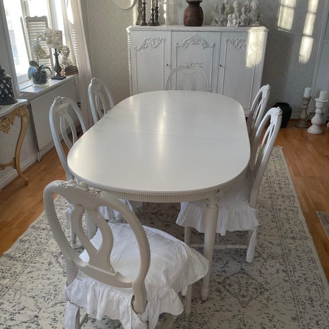 Gustaviansk Matgrupp, med runt matbord med två Iläggsskivor. + 4 stolar. Bordet från 110 cm - 220 cm. Bord har svarvade ben och en klassisk, lätt profilerad kant runt skivan. Stolarna har ribbad rygg och svarvade ben. Passar som matgrupp i kök eller matrum.