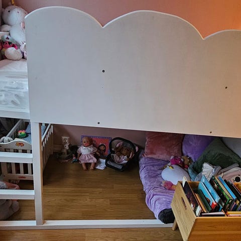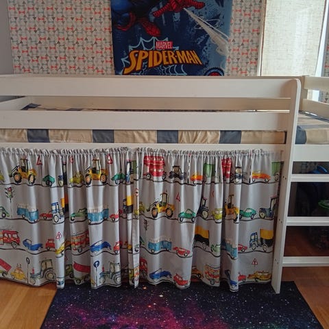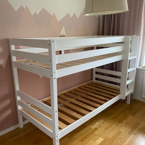 Hussäng (utan madrass) med lekyta under sängen.. Även ett utdragbart skrivbord med hylla. Vi har fäst tyg under som så man kan skyla förvaring eller ha det som koja. Kan skicka med om ni önskar.