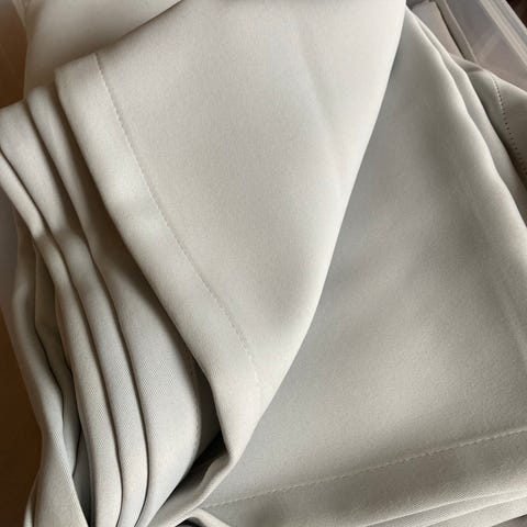 Har även mörkläggningsgardiner i ljusbeige.