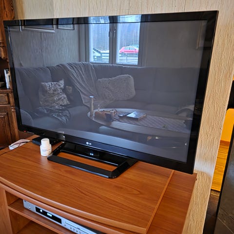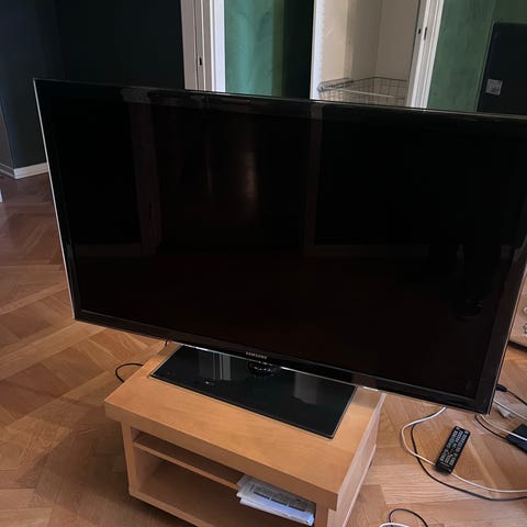 Samsung tv. Platt tv med fristående fot och medföljande fjärrkontroll, lämplig för placering på tv-bänk. Anslutningar och exakta specifikationer framgår inte av bilderna och kan kontrolleras på enhetens baksida eller i manual om den finns kvar.