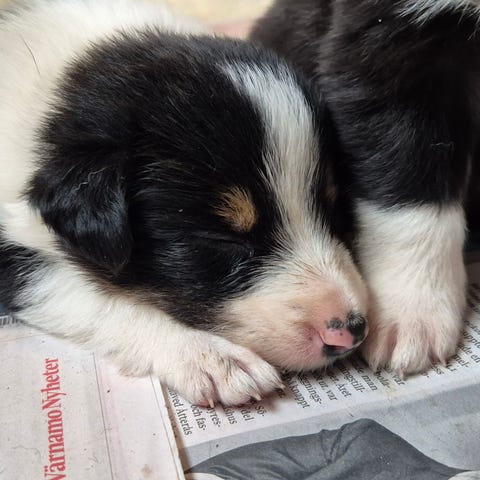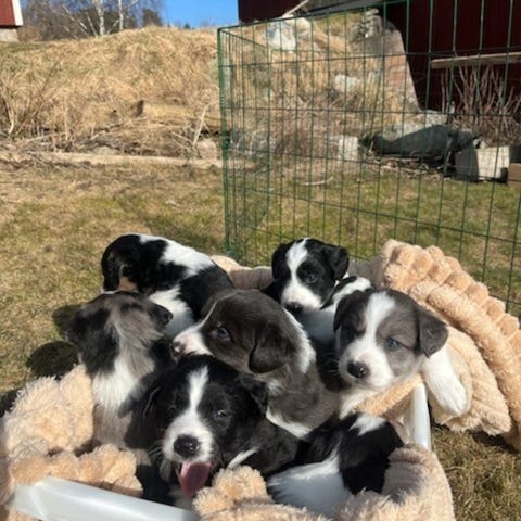Mamman är Border Collie som jobbar med gårdens djur, men gillar också att ta en spring- eller cykeltur i sele. Lugn och trevlig hund.
