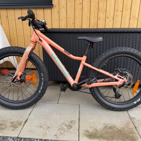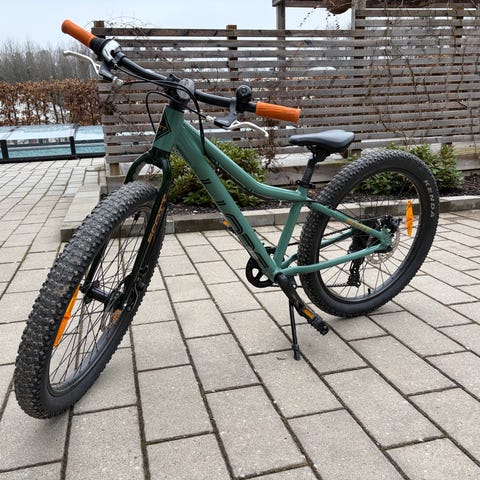 Barncykel med 24" hjul i orange färg. Utrustad med raka styren, handbromsar fram och bak samt växlar som manövreras från styret.