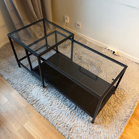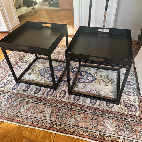 Två svarta soffbord som går in varandra och tar mindre plats när man inte har behov av båda. 150 kr för den stora och 100 kr för den mindre.