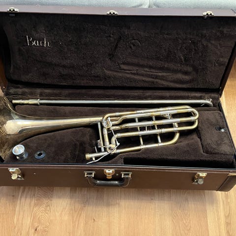 Trombon i äkta silver från True Sound och Birger Steiner. Inte putsad på flera år men det går lätt att fixa. Några synliga bucklor men gör ändå sitt jobb. Finns i Helsingborg.