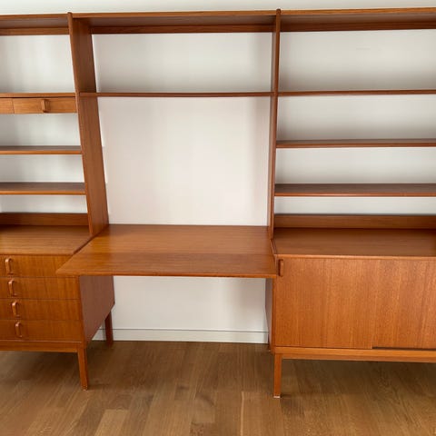 Sökord: teak, retro, 60-tal, 1960-tal, vintage, mid century, skandinavisk design, bokhylla, väggenhet, vitrinskåp, teakmöbel