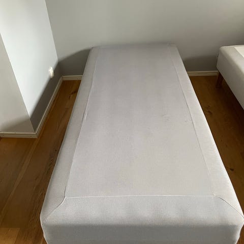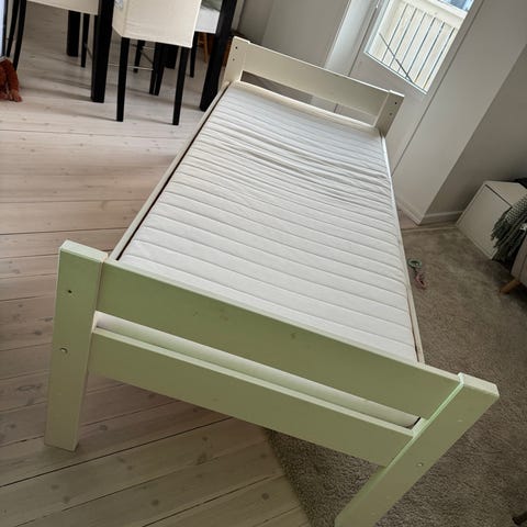 IKEA säng med ribbotten. Sängen har inbyggd ribbotten i trä och en fast madrass ovanpå. Passar som enkelsäng i sovrum, gästrum eller som extrasäng.