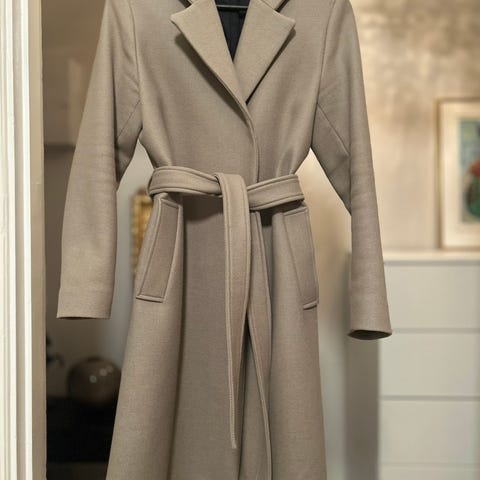 Stockh lm kappa för dam i storlek M. Kappan är beige och tillverkad i bomull. Modellen är knälång med dubbelknäppning framtill, avtagbart knytskärp i midjan och slejfar vid ärmsluten. Baksidan har ett ok och sprund för bättre rörelsevidd. Passar som ytterplagg under vår och höst