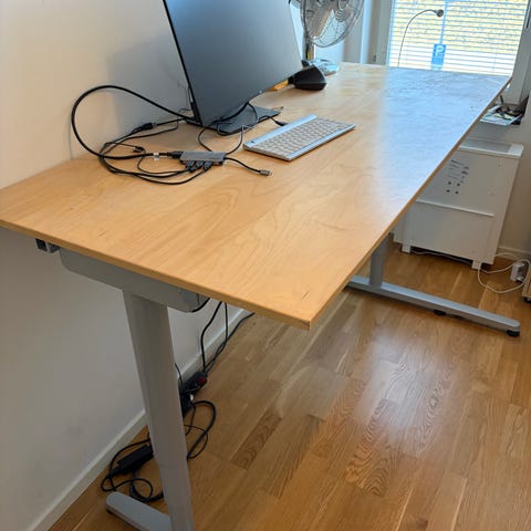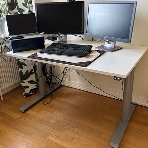 Höj och sänkbart och går även att vinkla bordet där dataskärmen står.